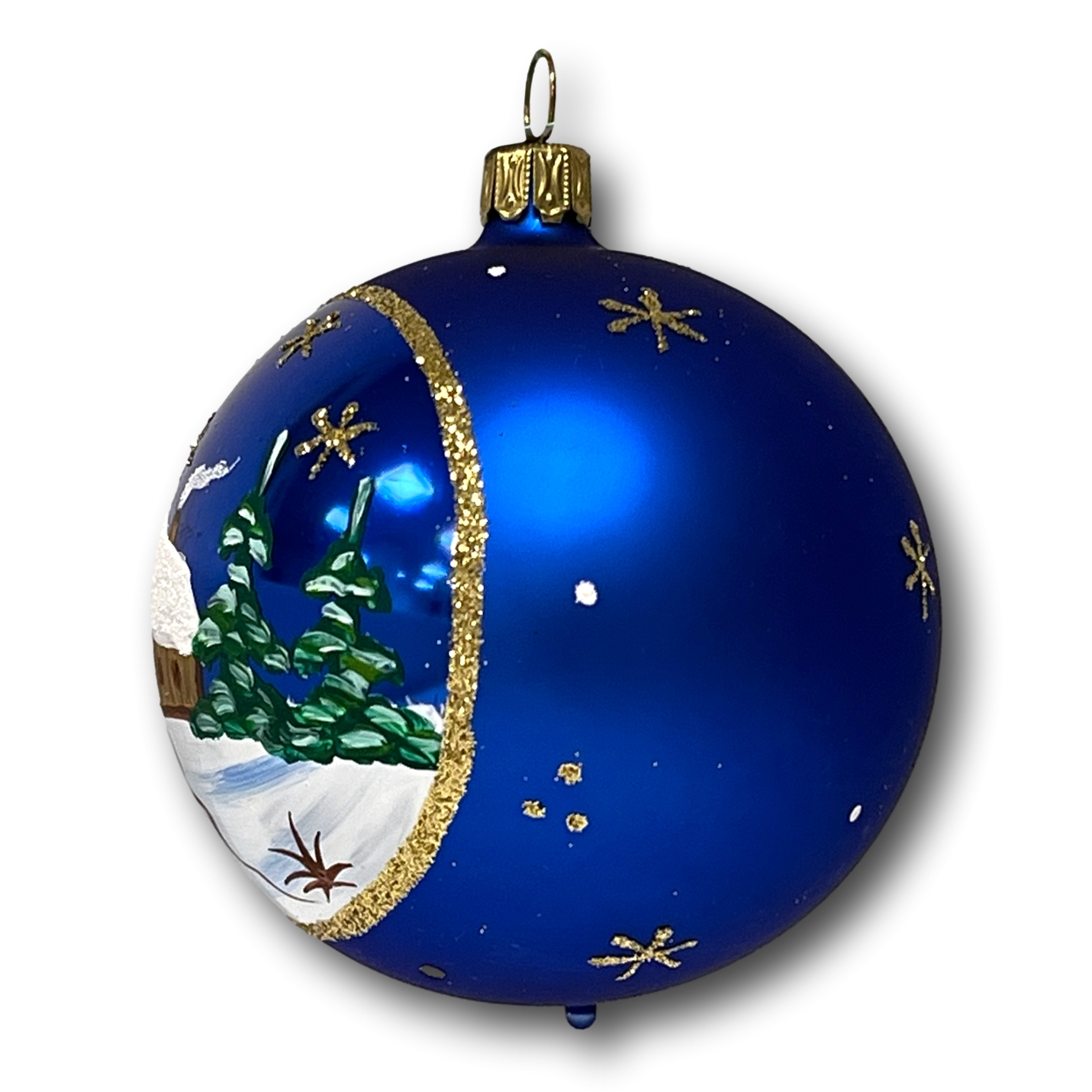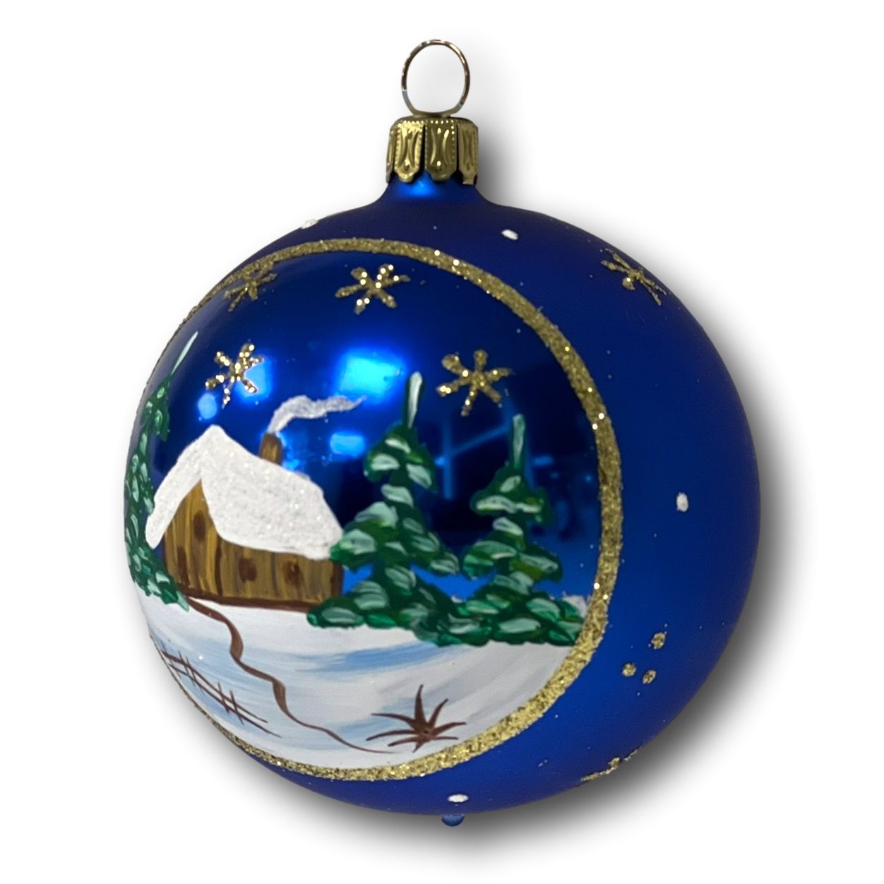 Diese von Hand gemalte Christbaumkugel fängt die winterliche Stimmung des Heiligabends ein. Am blauen Firmament leuchten die Sterne golden und weisen den Weg auf glitzerndem Schnee ins heimelige Haus am Berg.
