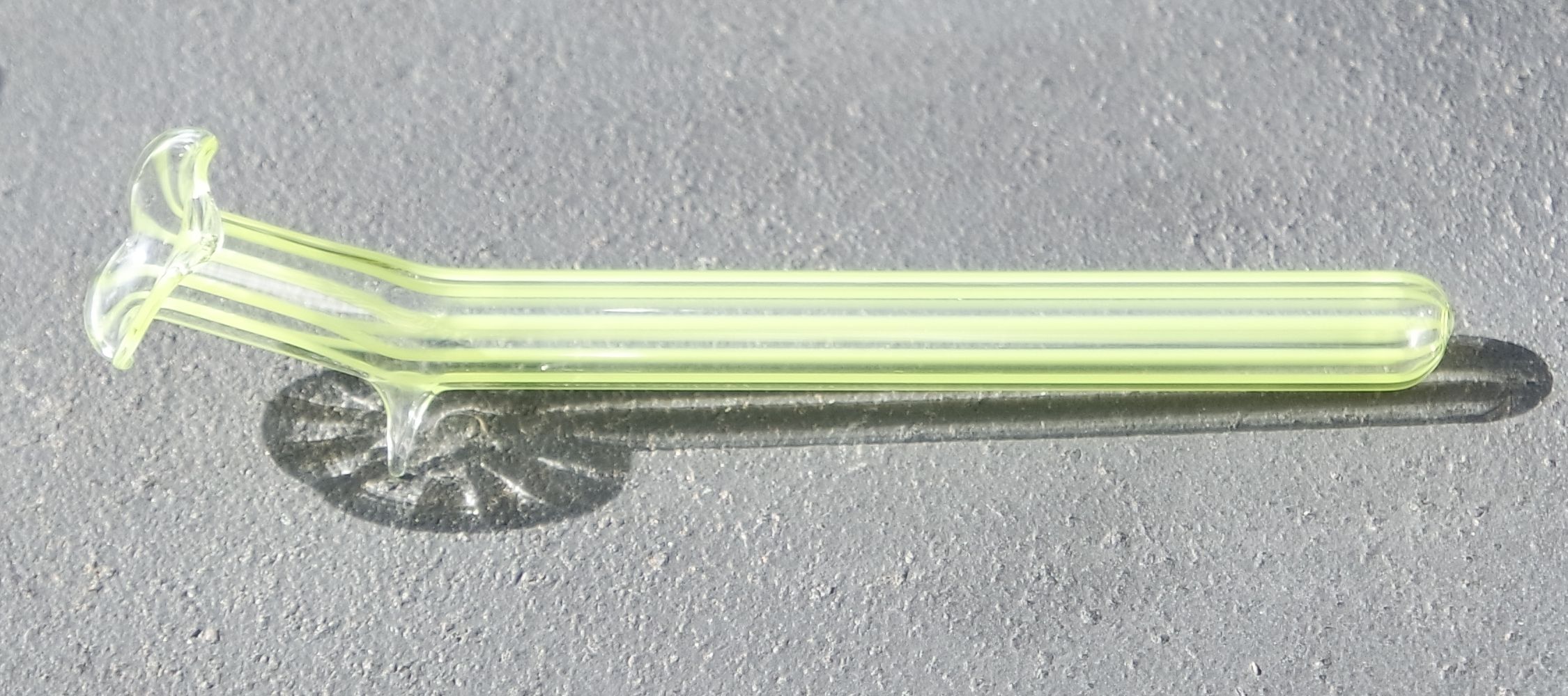 Damit die Liegevase auch funktionell überzeugt ist die Öffnung durch kleine, gläserne Füßchen angehoben, um etwas Wasser für eine Blüte zu aufzunehmen.