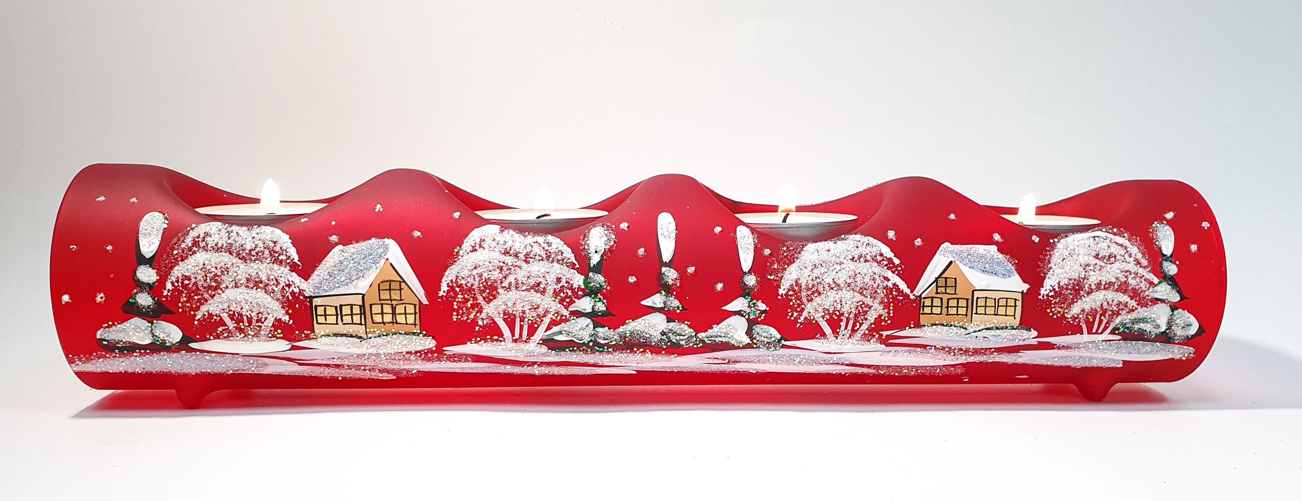 Motiv: Winterlandschaft, handgemalt auf rotem Grund matt